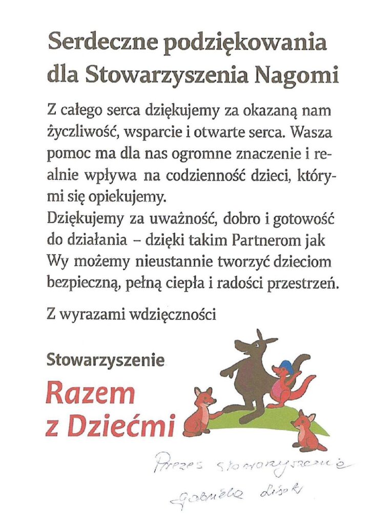 Jesteśmy zaszczyceni, że nasze stowarzyszenie otrzymuje wyrazy uznania za wsparcie i współpracę. Dziękujemy wszystkim, którzy doceniają nasze zaangażowanie i wspólne działania. Każde podziękowanie motywuje nas do dalszej pracy na rzecz wspólnego dobra.